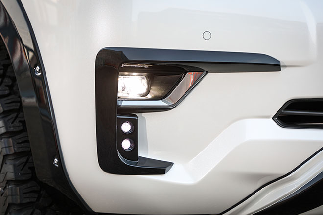 そんな後期にダブルエイトが用意したエアロが、この「エクストリームVer.」。じつはこれ以外にもハーフタイプの後期用ドレスアップ系エアロも手掛けているのだが、「エクストリームVer.」はそれも含め、これまで同社が手掛けてきたエアロとはまったく路線の異なる新アプローチを採用。パーツは前後バンパー中央のスキッドと呼ぶパネル、フォグまわりのエッジを強めたLED付きのガーニッシュ、そしてオーバーフェンダーといった布陣。デモカーのような車高は純正、タイヤはゴツ系のオールテレーンといった組み合わせを違和感なく受け入れてしまう魅力が持ち味で、ルーフやバンパーダクトに与えた市販LEDライトとの相性もヨシと、アクティブ色の強いオフシーンや荒涼とした大地を走る姿も良く似合う。愛知にあるサテライトショップ『GMG』では、この「エクストリームVer.」の新車コンプリートや、追加カスタムの相談も随時受け付けている。ぜひ足を運んで欲しい。
