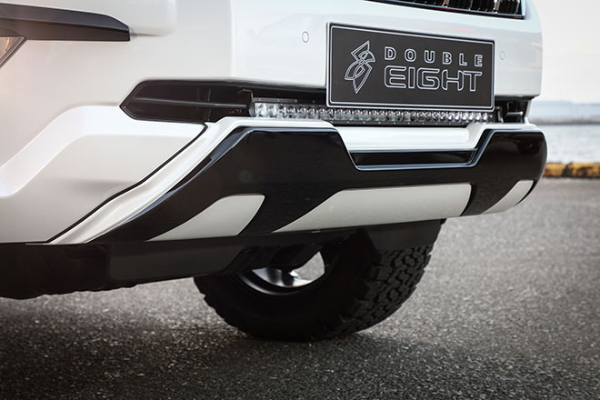 ランクル界の大本命ブランドとして、名実ともに人気の高いダブルエイト。2018年も攻勢の手綱が緩む気配は一切見られないが、そんな気鋭が展開する新作は150後期型プラドで仕掛ける「エクストリームVer.」。手軽に楽しめる“貼り”のボディキットだ。